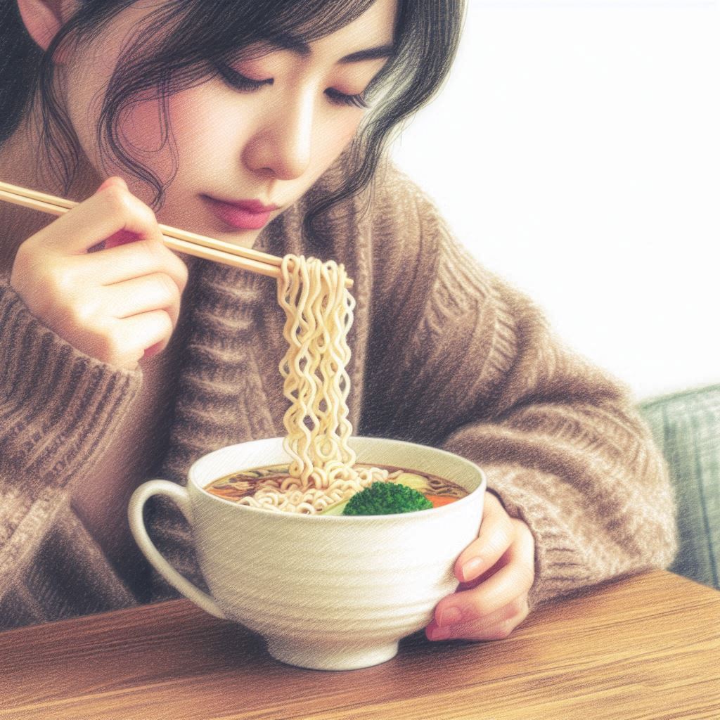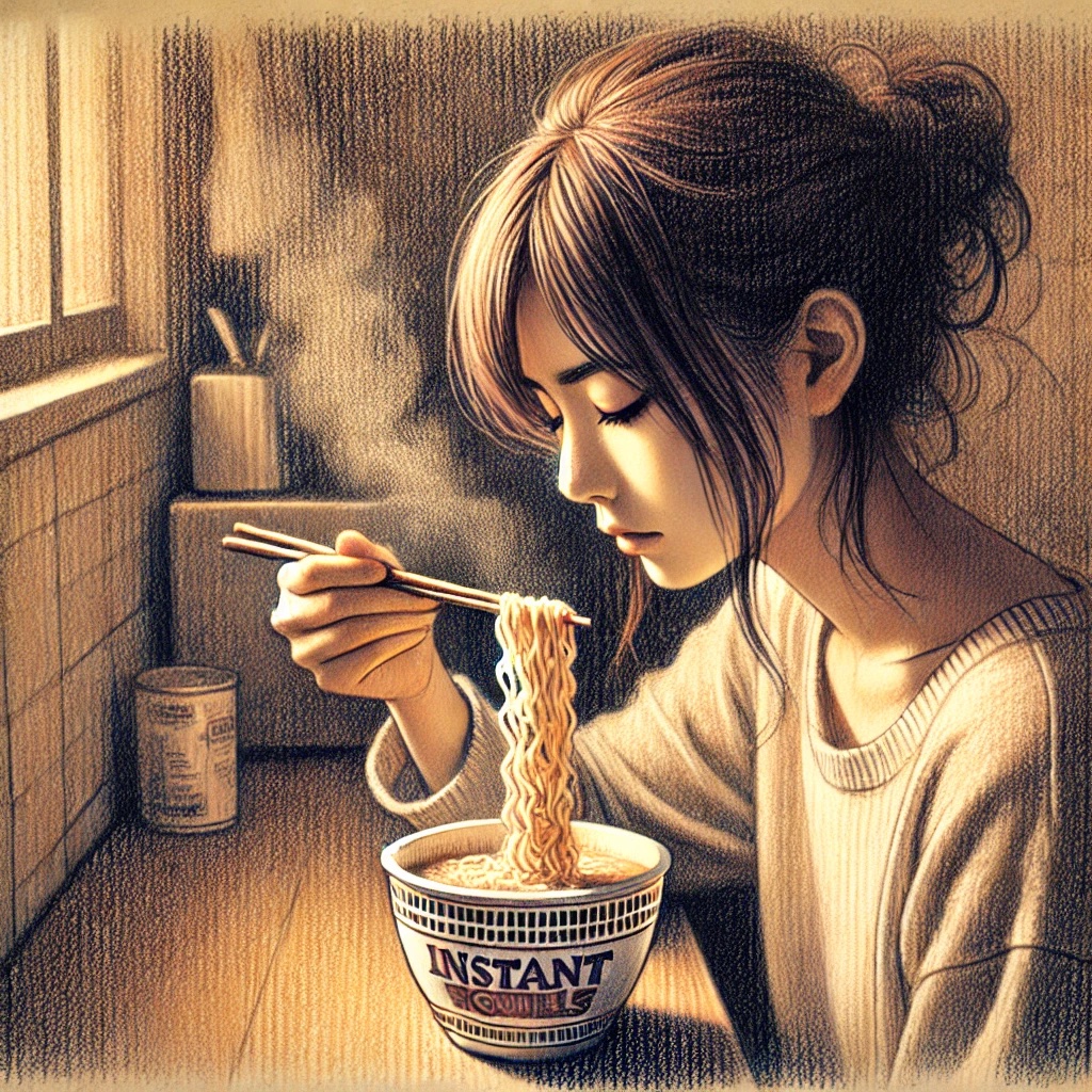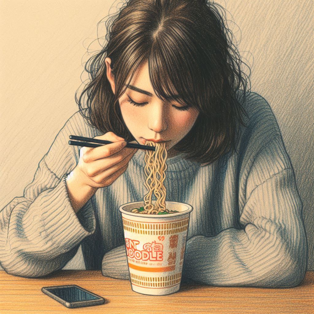 英語 - Please draw an image of a woman in her 20s eating a cup of instant noodles alone. The colored pencil style is preferred.