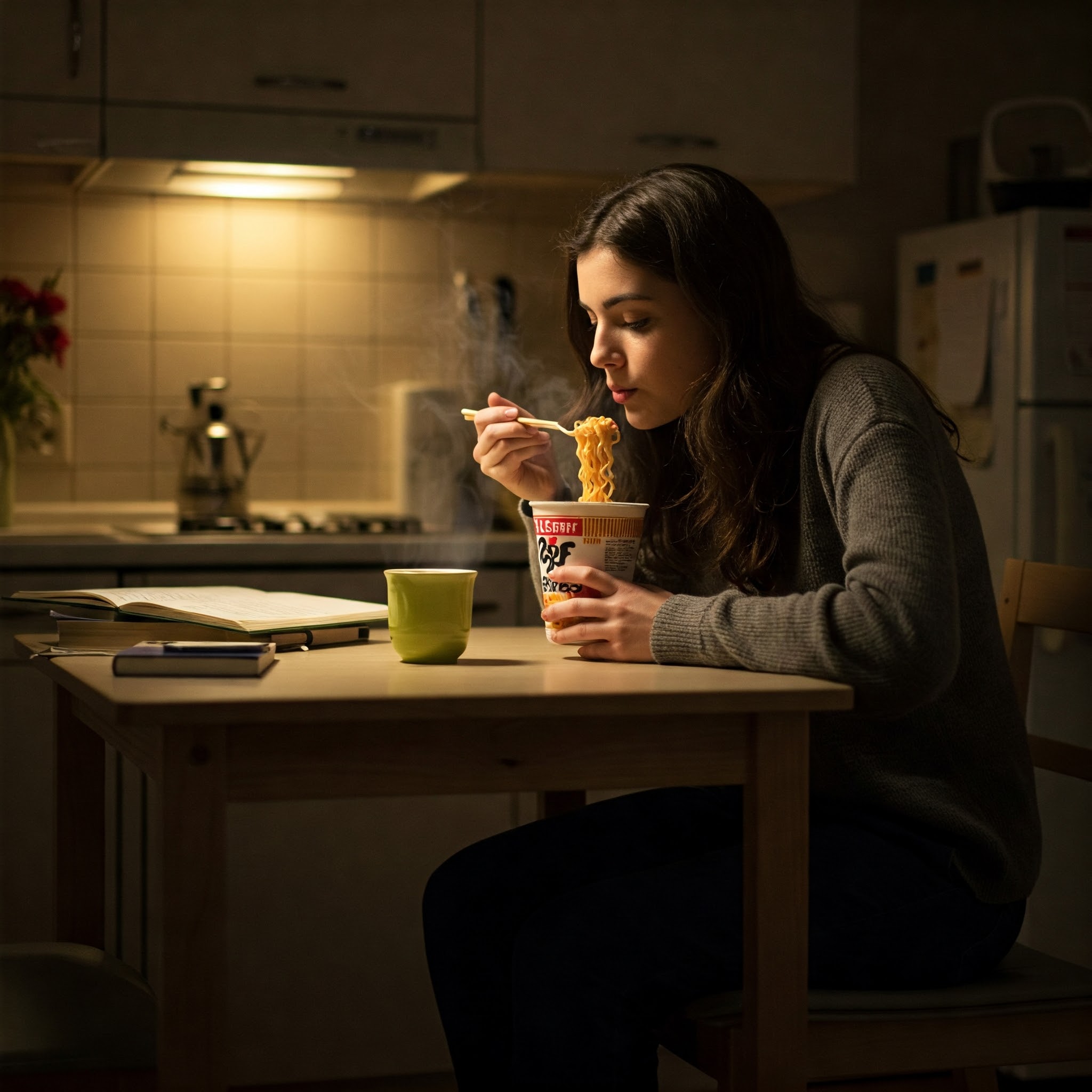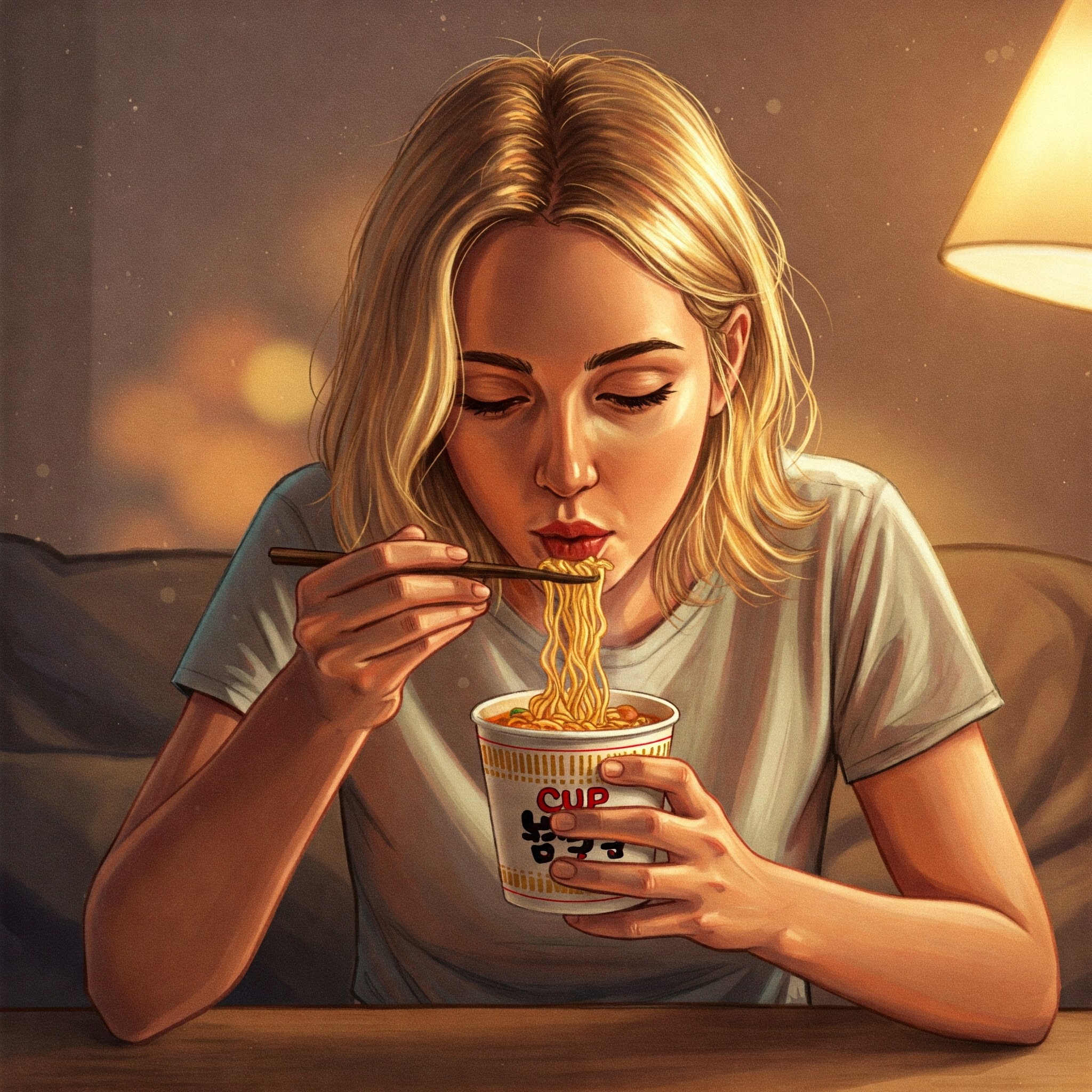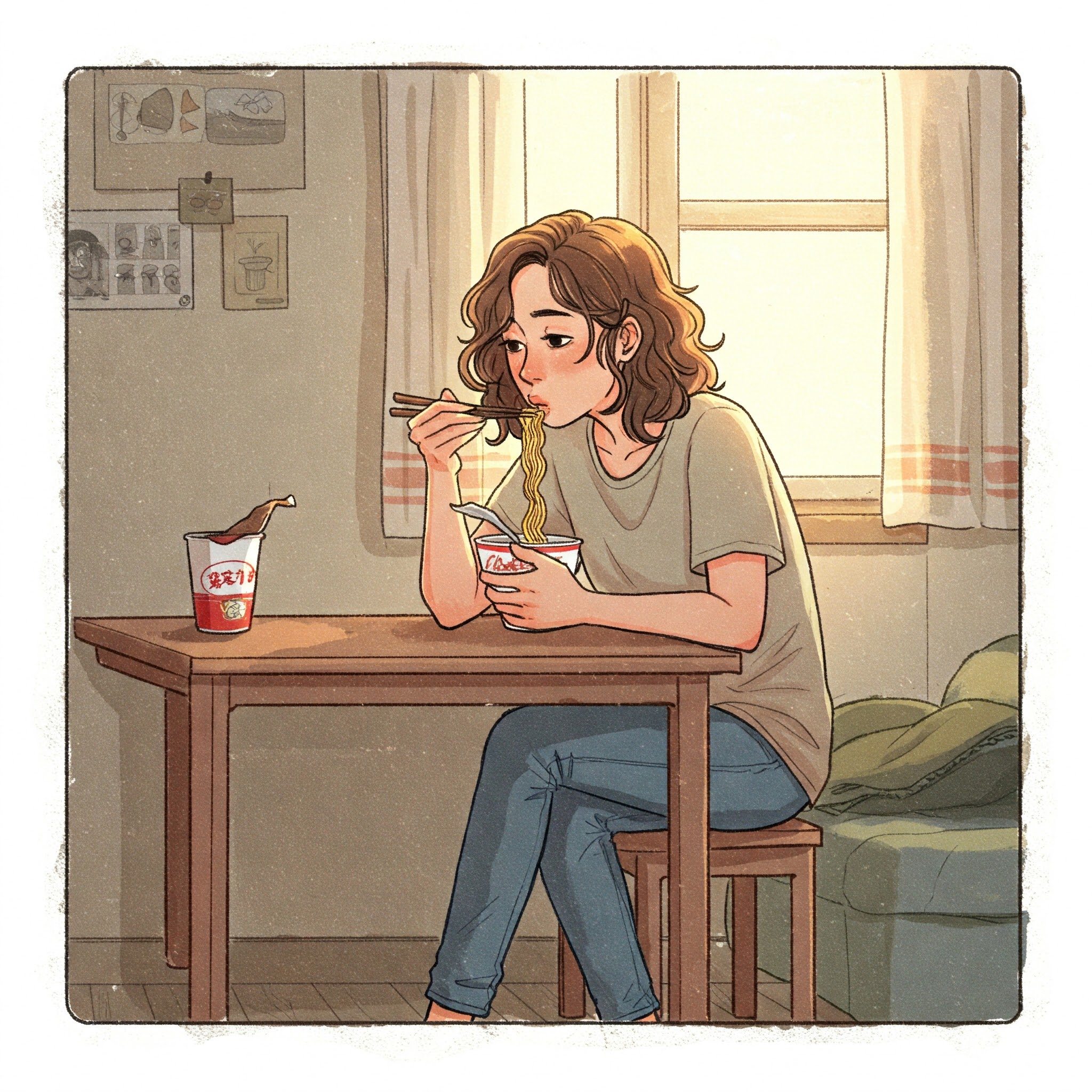 英語 - Please draw an image of a woman in her 20s eating a cup of instant noodles alone. The colored pencil style is preferred.