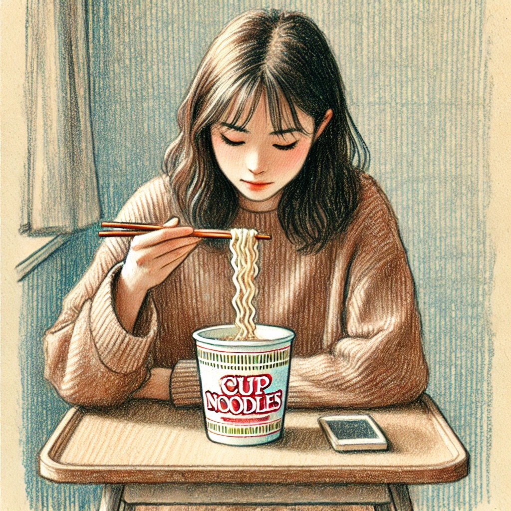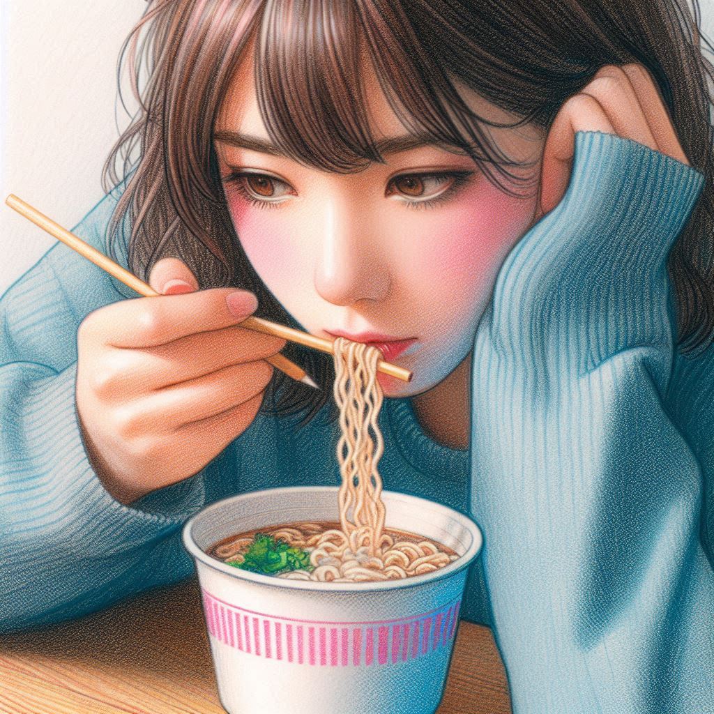 日本語 - 20代くらいの女性が、ひとりでカップ麺を食べている画像をお願いします。色鉛筆風がよいです。